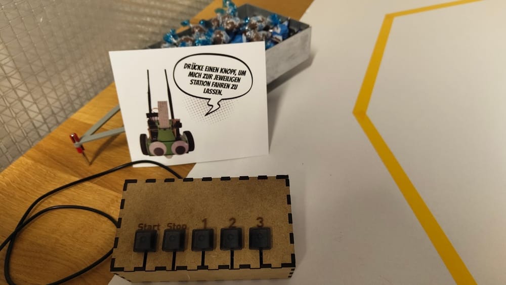 The project features an Nvidia Jetbot trained to autonomously follow lines on the floor and has an API endpoint for controlling it. It can be called to different stations to deliver Candy. The Robot identifies the stations by scanning for April tags that mark the stations. If the right tag is detected, it waits for a few seconds, so Candy can be grabbed. The remote for the demo is build with an esp32 that simply calls the endpoints of the Robot.